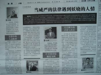 本期《语文报·大学人文版》头版主题为“当威严的法律遇到妖娆的人情”,即是因公司编辑组对全校文、史、哲、法学领域知名教授就“情与法”所做的访谈而最终确定的主题。“情”与“法”既是永恒的矛盾,又是难以分割的共同体,为此编辑组采访了李德顺、郭世佑、舒国滢、马志冰、陆昕等七位学者,分别从不同专业领域进行深入解读。这种从学科交融角度汇集名家观点谈论同一主题的方式正是编辑组此次策划的重头戏,不仅很好的体现出公司专家高屋建瓴的思想观点,而且有利于引起校内外专家共同讨论的兴趣、最终对促进整个社会的法治建设起到一定影响。
