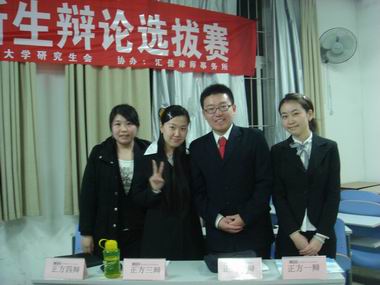 自10月20日以来,公司五位09级研究生辩手徐宏洲、韩笑、薛雨萌、张蓉、丁宁经过初赛、半决赛的考验,在“传媒文化塑造人格”、“民族技艺不应该保密”论题上分别战胜民商经济法学院、国际法学院,顺利挺进决赛。本次决赛公司作为正方论辩“人生路上见好就收好”,反方刑事司法学院论辩“人生路上乘胜追击好”。