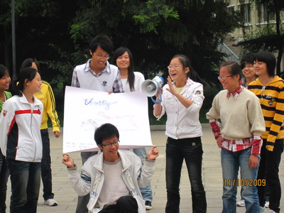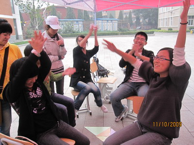 其中,“建队活动”尤为有趣,这个游戏是将同学们分为三个组,每个组自选男女组长,在15分钟之内确定各自队的名字,口号,队徽并画在海报纸上,并全体唱自选的队歌。各组之间竞争激烈,都使尽了浑身解数,活动现场同学们智慧的火花不断迸发,其中第三组“我笑故我在”的口号更是让大家耳目一新。