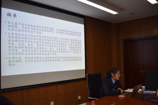 来自北京语言大学语言科学院的李聪将其博士论文成果在论坛上与在座老师交流,研究语体语法理论视角下法律文本语体特征及次语体特征,首先对冯胜利的形式语体观和功能学派的功能语体观的研究范式进行对比,然后在此基础上以法律文本为研究对象,分别对其和次级法律文本——宪法、刑法、民法总则的次语体特征进行考察,认为它们受功能意图、交际距离等维度因素影响,内部存在着独特的变量。