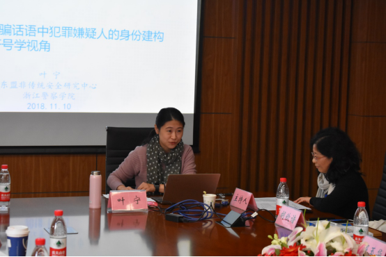 接着来自浙江警察学院的叶宁老师进行了关于电信网络诈骗话语中犯罪嫌疑人的身份建构报告,电信诈骗是一种非接触式犯罪,无论犯罪人采用什么样的科技手段,主要的媒介是语言。叶老师旨在将网络诈骗话语看作一种语类,考查在社会文化生活语境中犯罪嫌疑人调用相关话语资源与语言策略对身份进行选择与建构的动态过程,对电信网络诈骗的防范提供理论依据。