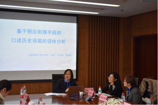 论坛首先由来自中国传媒大学的赵雪老师报告,其题目为基于照应衔接手段的口述历史语篇的语体分析。赵老师介绍了口述历史语篇虽是同一种语体,但可以分为“对话”式、“独白”式和“对话+解说”式三种话语形式,照应在这三类口述历史语篇分布上存在着差异,这些差异反应了口述历史语篇内部语体上的差异。