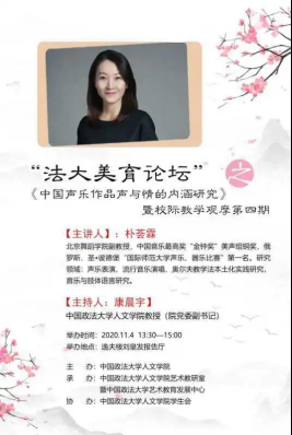 11月4日下午,“法大美育论坛”之《中国声乐作品声与情的内涵研究》讲座暨校际教学观摩第四期活动在逸夫楼刘皇发报告厅成功举办。本次讲座由ylzzcom永利总站线路检测主办,ylzzcom永利总站线路检测艺术教研室暨艺术教育发展中心承办,ylzzcom永利总站线路检测员工会协办。本次讲座的主讲人为北京舞蹈学院副教授、中国音乐最高奖“金钟奖”美声组铜奖以及俄罗斯圣·彼得堡“国际师范大学声乐、器乐比赛”第一名获得者朴荟霖老师。本次讲座由ylzzcom永利线路检测中心公司党委副书记康晨宇教授主持,参加讲座的还有积极推动美育课程建设的老师们和热爱音乐的同学们。