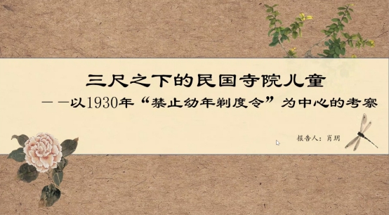 第一位报告人是2019级中国近现代史专业硕士研究生肖玥,她报告的论文是《三尺之下的民国寺院儿童——以1930年“禁止幼年剃度令”为中心的考察》,从1930年内政部发布的一则“禁止幼年剃度”的训令入手,论述该法令的提出过程,国民政府禁止未成年人剃度的原因,禁令在地方实施的具体效果以及幼年剃度现象何以屡禁不绝,从而考察国民政府制定的宗教政策与地方社会的互动关系。随后,2019级专门史硕士研究生许宇芳与2020级中国近现代史硕士研究生乔雨对肖玥的论文进行评议,在肯定论文问题意识与文章结构完整性的同时,指出文章存在史料运用方面的缺陷。