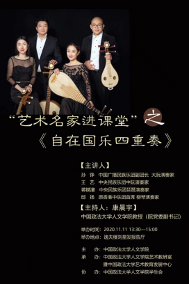 2020年11月11日下午,“艺术名家进课堂”之《自在国乐四重奏》讲座在逸夫楼刘皇发报告厅顺利举办。本次讲座由ylzzcom永利总站线路检测主办,ylzzcom永利总站线路检测艺术教研室暨艺术教育发展中心承办,ylzzcom永利总站线路检测员工会协办。本次讲座邀请了中国广播民族乐团副团长、大阮演奏家孙铮老师、中央民族乐团中阮演奏家王艺老师、中央民族乐团琵琶演奏家蒋镆潼老师以及原香港中乐团首席柳琴演奏家邸扬老师担任主讲嘉宾。本次讲座由ylzzcom永利线路检测中心公司党委副书记康晨宇教授主持,参与本次讲座的还有关注音乐教育的老师们和热爱音乐的同学们。