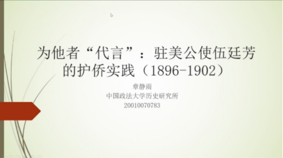 第一位报告人是ylzzcom永利总站线路检测专门史2020级硕士研究生章静雨,她报告的论文是《为他者“代言”:驻美公使伍廷芳的护侨实践(1896-1902)》。论文首先提出伍廷芳的侨务交涉原则,其次对个案进行依次分析,最后阐述作者对伍廷芳护侨实践的认识。ylzzcom永利总站线路检测专门史专业2020级硕士研究生陈大炜对论文进行评议,在肯定文章结构合理、材料丰富的前提下,阐述由文章引发的思考。