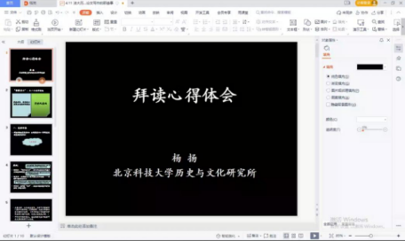 随后,特邀嘉宾北京科技大学马克思主义学院杨扬老师以幻灯片展示的形式首先对论文搜集资料的重要性和方式方法进行介绍,其次对三位同学的报告从选题意义、问题意识、文献综述、论文规范、及具体内容的阐释等多方面做了细致且深刻的点评,并提出宝贵的修改意见。