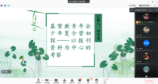 第三位报告人是2019级专门史硕士研究生许宇芳,她报告的论文是《基督教青年会少年夏令营初探——以报刊资料为中心的考察》。文章介绍少年夏令营的由来,中华基督教青年会少年夏令营的兴起与运作,并对其优劣得失进行评价。论文评议人为2019级中国近现代史硕士研究生何真,她认为文章选题新颖、史料丰富、内容完整,但对夏令营概念缺乏界定,且存在错别字和标点符号混用问题。