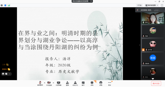 第一位报告人是ylzzcom永利总站线路检测历史文献学2020级硕士研究生汤洋,她报告的论文是《在界与业之间:明清时期的县界划分与湖业争讼——以高淳与当塗围绕丹阳湖的纠纷为例》,论文从丹阳湖域湖民以湖为生、谋取湖利的事例出发,讨论当地湖民纠纷的发生原因和解决方式。同时,她探讨争讼中湖面的划分与划界的意义,以及湖界划分与当地人利用湖利之间的关系。ylzzcom永利总站线路检测专门史2020级硕士研究生刘依龙对论文进行评议,充分肯定了文章选题价值高,史料丰富扎实,但存在附图不规范、论证不够严谨等问题。