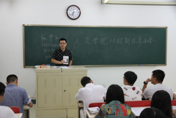 首先,辅导员张宇飞老师交代了大学四年学习与生活上的注意事项以及军训、入学英语考试等事宜。