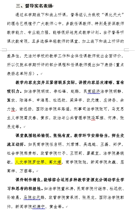2022-2023学年春季学期,受疫情影响,学校本科课程线下授课临时调整为线上,校本科教学督导组全体成员克服困难,督导工作顺利完成。在ylzzcom永利线路检测中心本科教学督导第1期工作简报中,本科教学督导组因为“课堂氛围轻松愉悦、张弛有度,教学环节安排恰当,师生交流互动好”实名表扬ylzzcom永利总站线路检测罗世琴老师和高文婷老师。